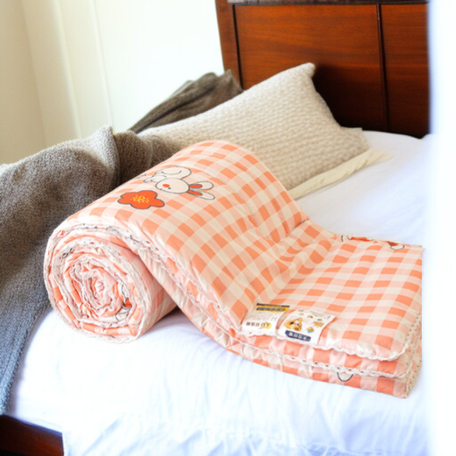大豆繊維使用、肌に優しい抗菌サマーキルト。薄型設計で学生寮のダブルサイズに最適。快適な通気性と清潔さを維持。