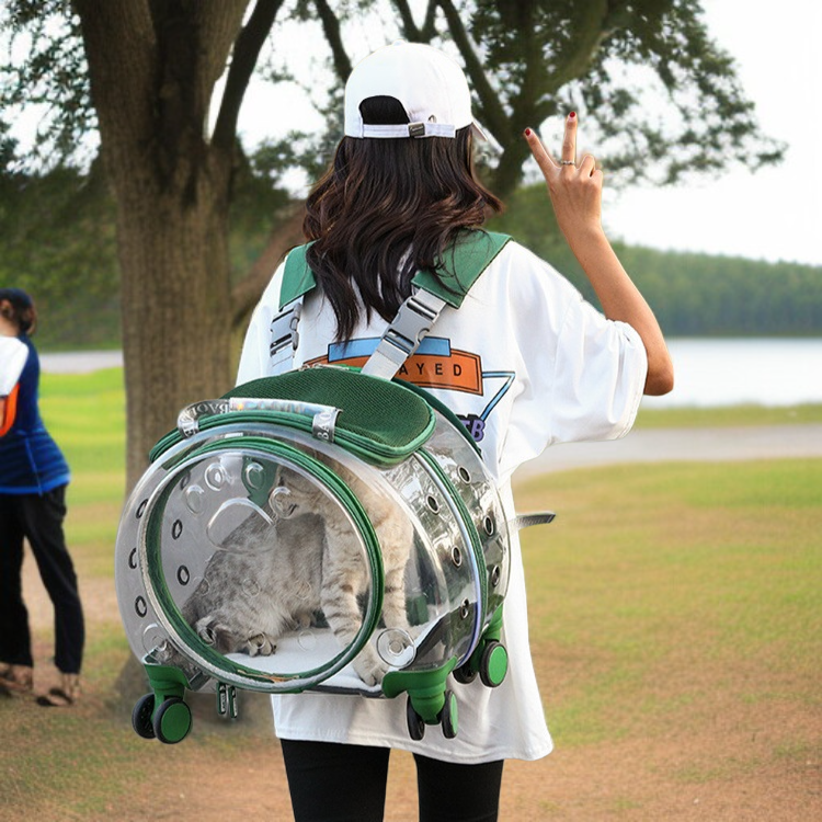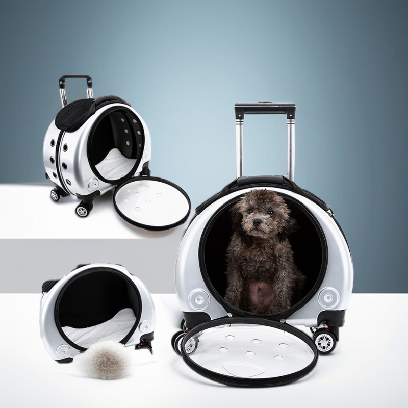 小型犬猫用透明スペースカプセルデザイン。大容量で通気性良好、ショルダー・手提げ両用。お出かけや旅行に便利な多目的ペットトロリーケース。
